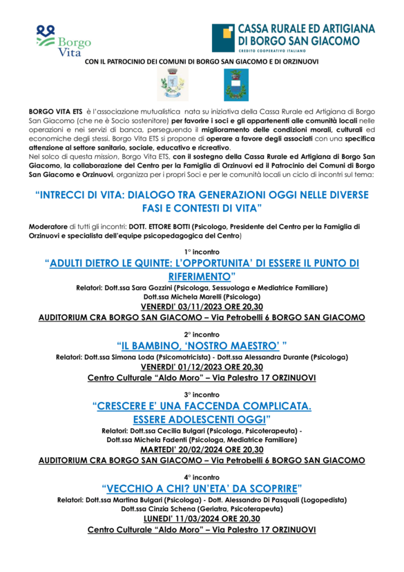 Borgo vita ETS propone "intrecci di vita: dialogo tra generazioni oggi nelle diverse fasi e contesti di vita" composti da quattro diversi incontri: