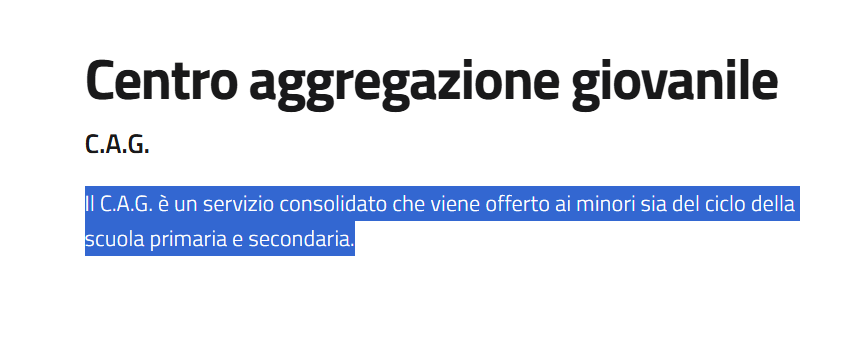 Il servizio è attivo dal mese di settembre/ottobre al mese di giugno. L’orario stabilito prevede l’apertura pomeridiana dalle 14,30 fino alle 18,30.Il C.A.G. ha sede presso l’oratorio Jolly . L 'Amministrazione comunale valorizza e sostiene le iniziative promosse dall'oratorio Jolly finalizzate all’attivazione di servizi e/o iniziative a favore di bambini e/o ragazzi.